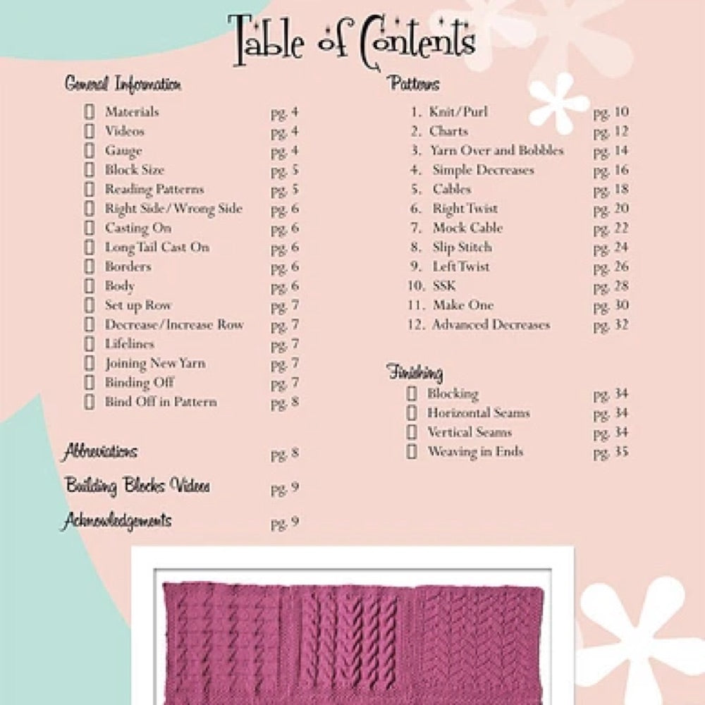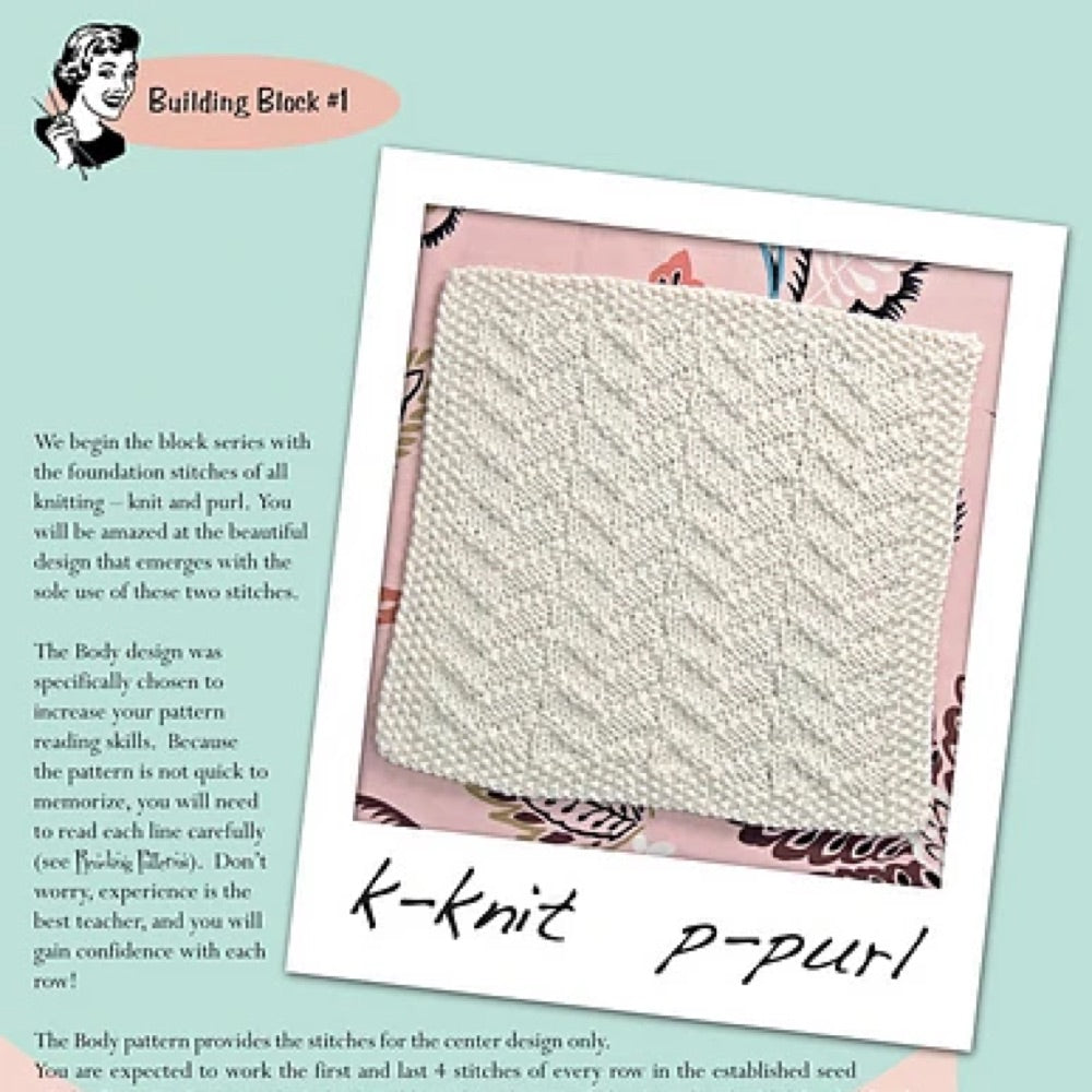 “Building Blocks” is a series of 12 fun patterns that will build your knitting skills. Starting with simple knit and purl stitches, your confidence will grow as you progress through several major knitting principles. Each block focuses on new stitches and techniques in a sequential fashion that “builds” upon the previously learned skill.