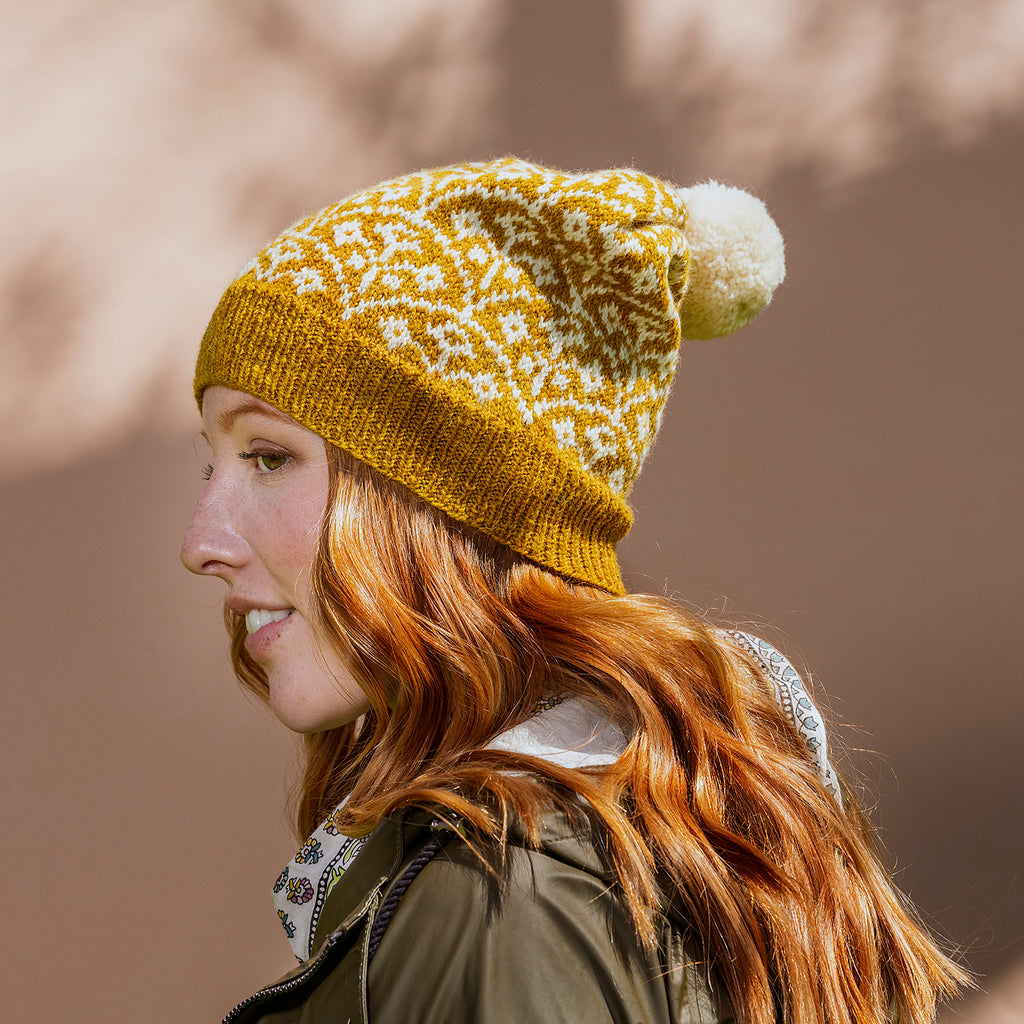 We couldn’t resist casting on this beautiful colorwork hat in our newest yarn, Camper by Kelbourne Woolens! This hat by designer Kate Gagnon Osborn combines timeless stranded colorwork with simple shaping and a cozy ribbed brim. Finished with a playful pom pom, it’s a knit that’s equal parts tradition and modern charm. A perfect first project to try out Camper’s soft hand and lovely stitch definition.