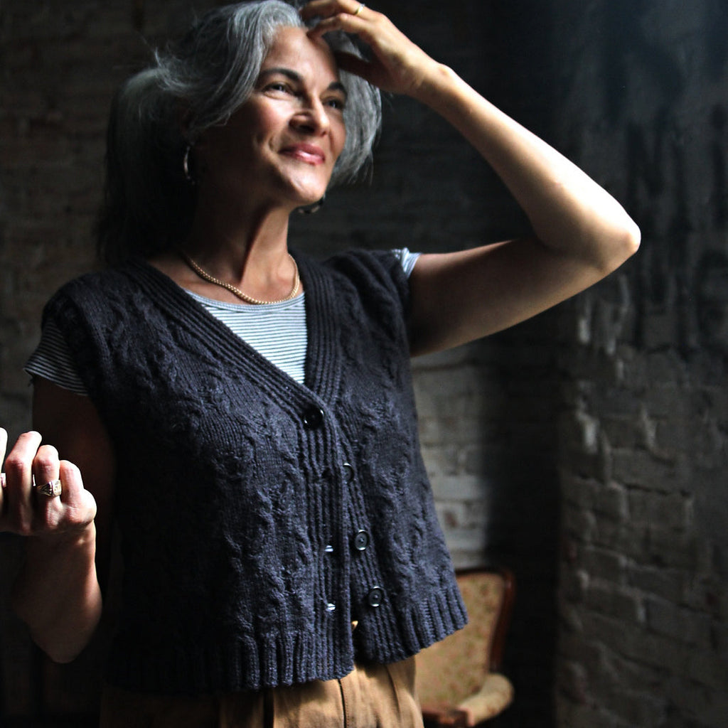 Cozy up with a classic this season! The Smokeshow Vest features an allover cable pattern, twisted rib button bands, and a timeless silhouette that pairs beautifully with anything in your wardrobe. We’re knitting ours in mYak Baby Yak Medium, whose soft hand and rich color make this piece quietly stunning - and a joy to knit.