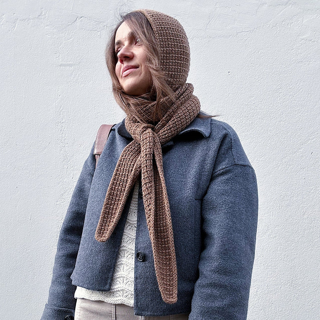 To fit head circumference 53-56 (57-60) cm / 20.75-22.0 (22.5-23.75)’’; finished measurments - Hood depth: 21 (23) cm / 8.25 (9.0)’’; Hood length: 20 cm / 7.75’’; Straps length: 105 cm / 41.25’’.